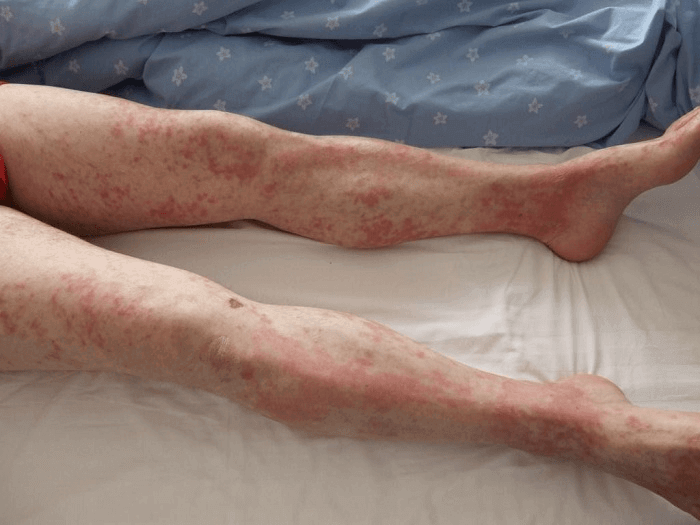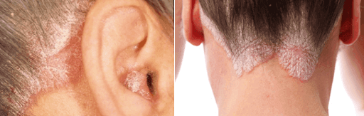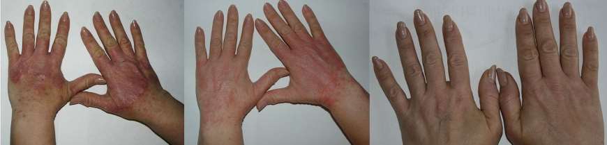 La psoriasis en placas clásica se manifiesta por áreas rojas de la piel con picazón y descamación excesiva. Las lesiones ocurren en el lado extensor (externo) de las articulaciones y el cuero cabelludo. La mayoría de los pacientes se avergüenzan de estas placas, usan ropa cerrada y evitan exponer las áreas afectadas.